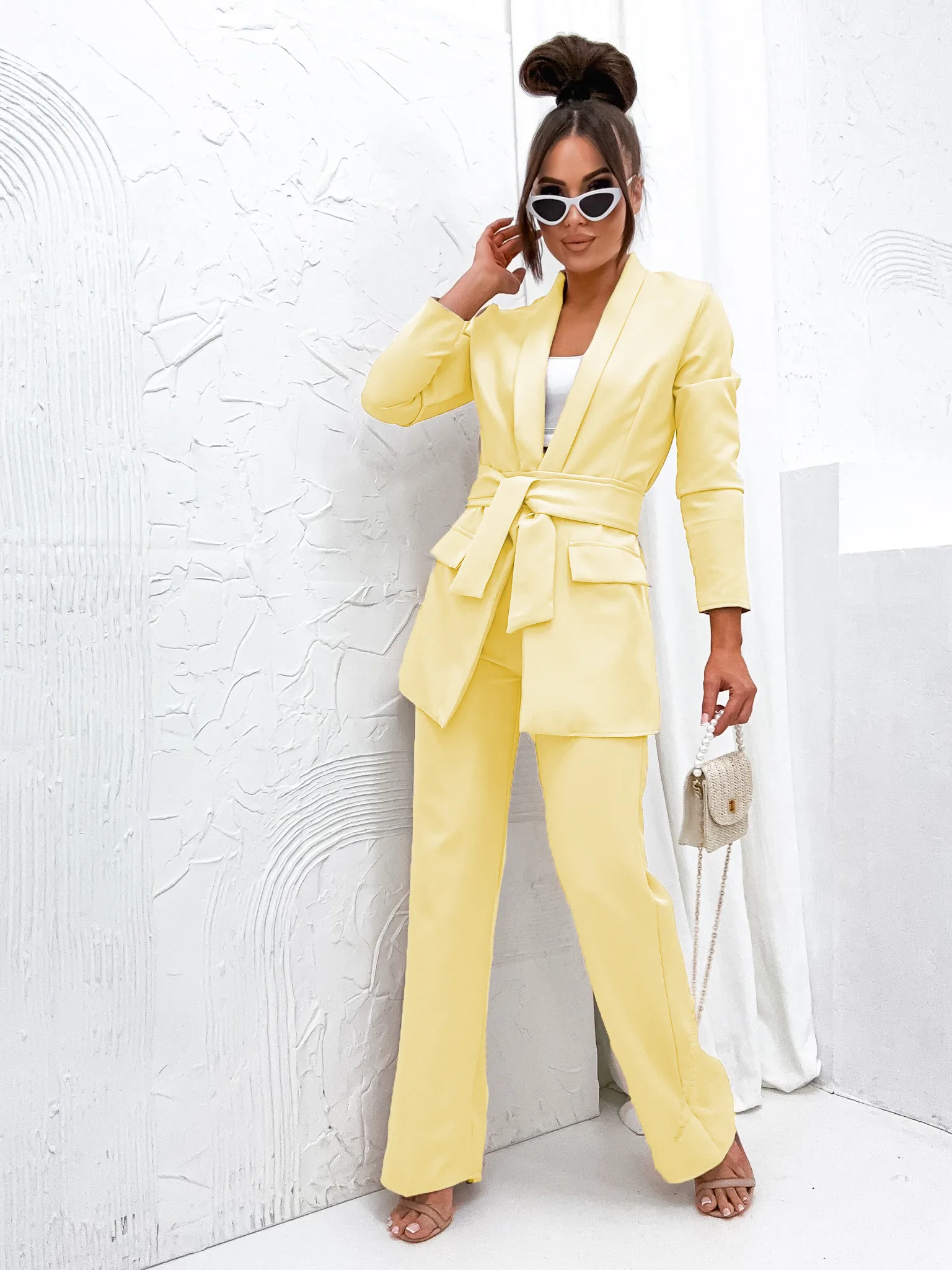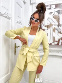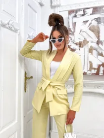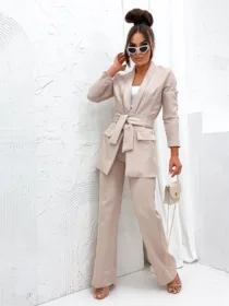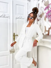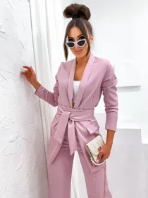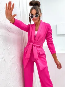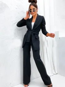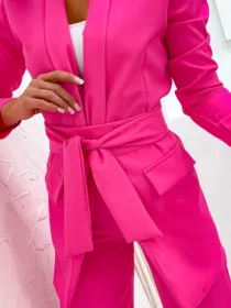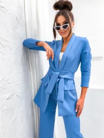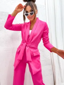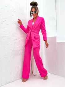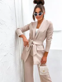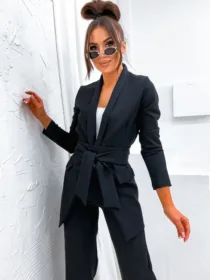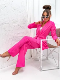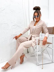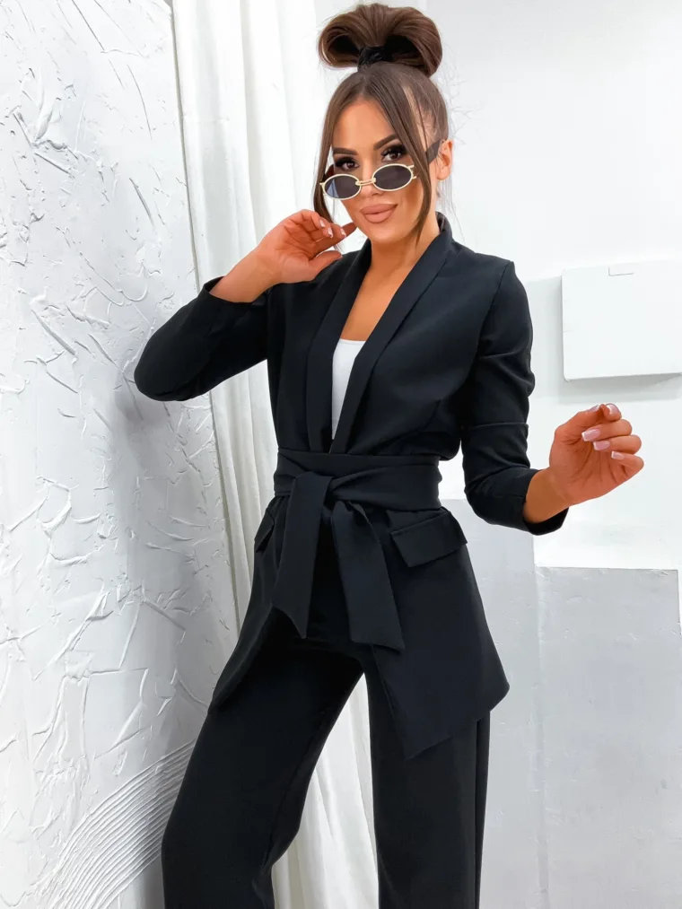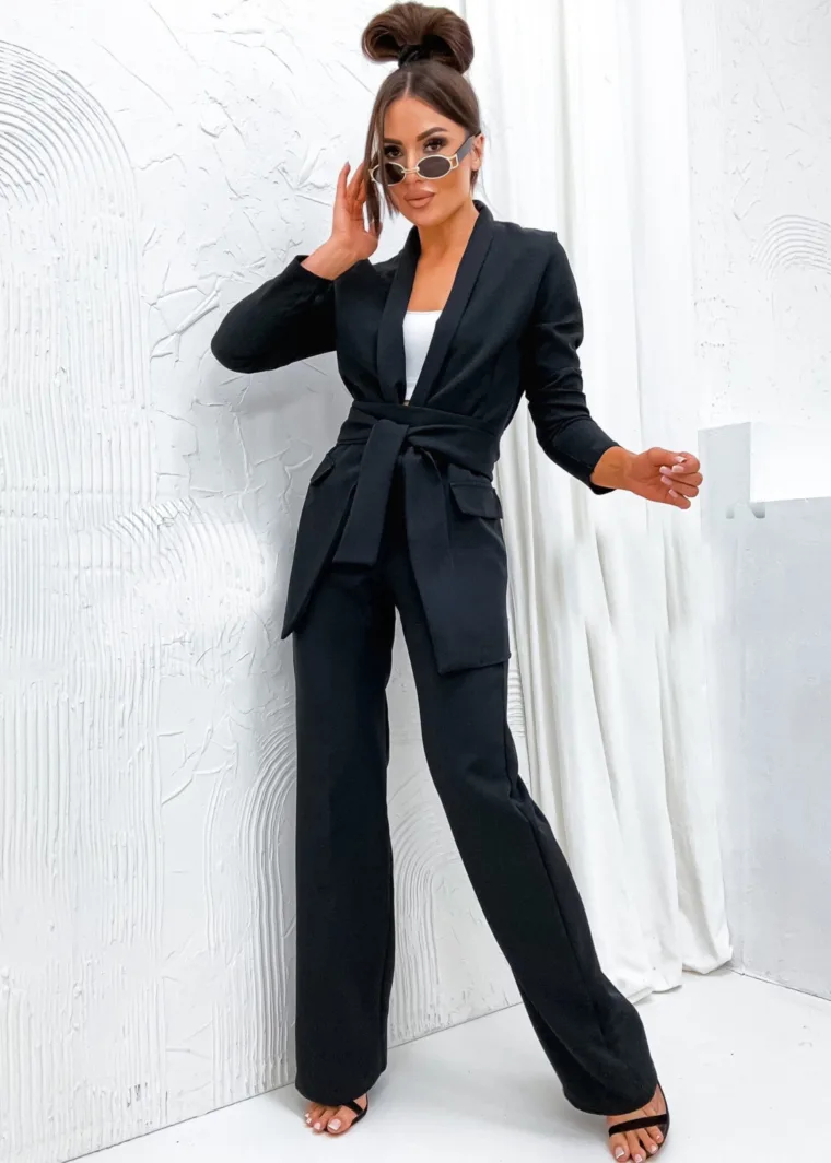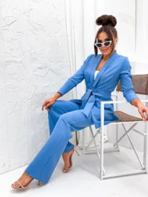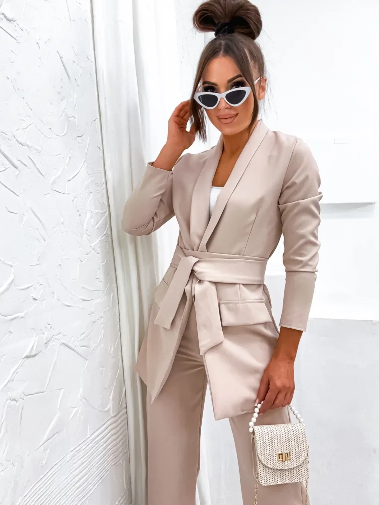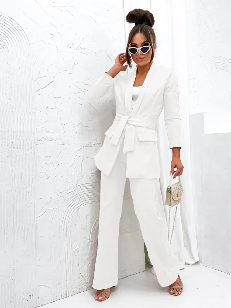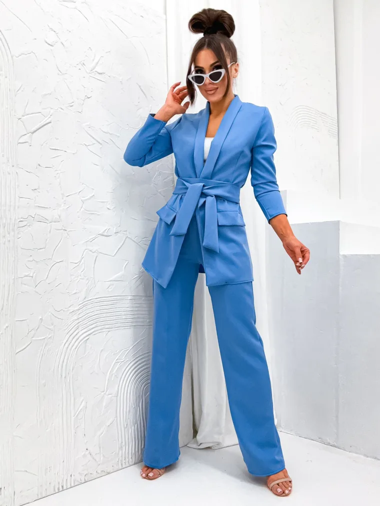 Garnitur Bella z pasem to esencja kobiecej elegancji i nowoczesnego stylu. Dostępny w hurtowni odzieży MOON w bogatej palecie kolorów, wykonany z komfortowej i trwałej mieszanki poliestru z elastanem, składający się z szykownych szerokich spodni z kieszeniami i stylowej marynarki z paskiem w talii, to idealna propozycja dla butików pragnących zaoferować swoim klientkom ponadczasową klasykę z nutą nowoczesności. Wszechstronność stylizacji i wysoka jakość wykonania sprawiają, że garnitur Bella z pewnością stanie się bestsellerem w Twojej ofercie.
