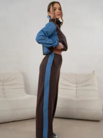 Stylowy Zestaw: Komplet składa się z modnej kurtki typu katana zapinanej na guziki oraz dopasowanych spodni podkreślających sylwetkę.