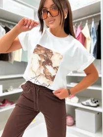 Bawełniany komplet damski z nadrukiem „Amour” i dopasowanymi spodniami. Nowoczesny, sprzedażowy model do butików odzieżowych – idealny na sezon wiosna/lato. Komfortowy materiał, modny print, wysoka rotacja w sprzedaży detalicznej.