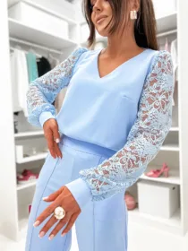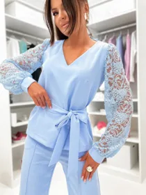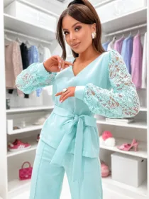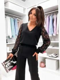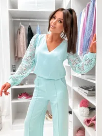 Odkryj Komplet Gala od e-moon.pl – polskiego producenta eleganckiej odzieży damskiej! Ten dwuczęściowy zestaw to kwintesencja klasy i kobiecości. Bluzka z dekoltem w serek oraz efektownymi koronkowymi rękawami w połączeniu ze spodniami z modnym przeszyciem tworzy idealną stylizację na wyjątkowe okazje. Niezastąpiony wybór na komunie, wesela i chrzciny w bezkonkurencyjnej cenie hurtowej.