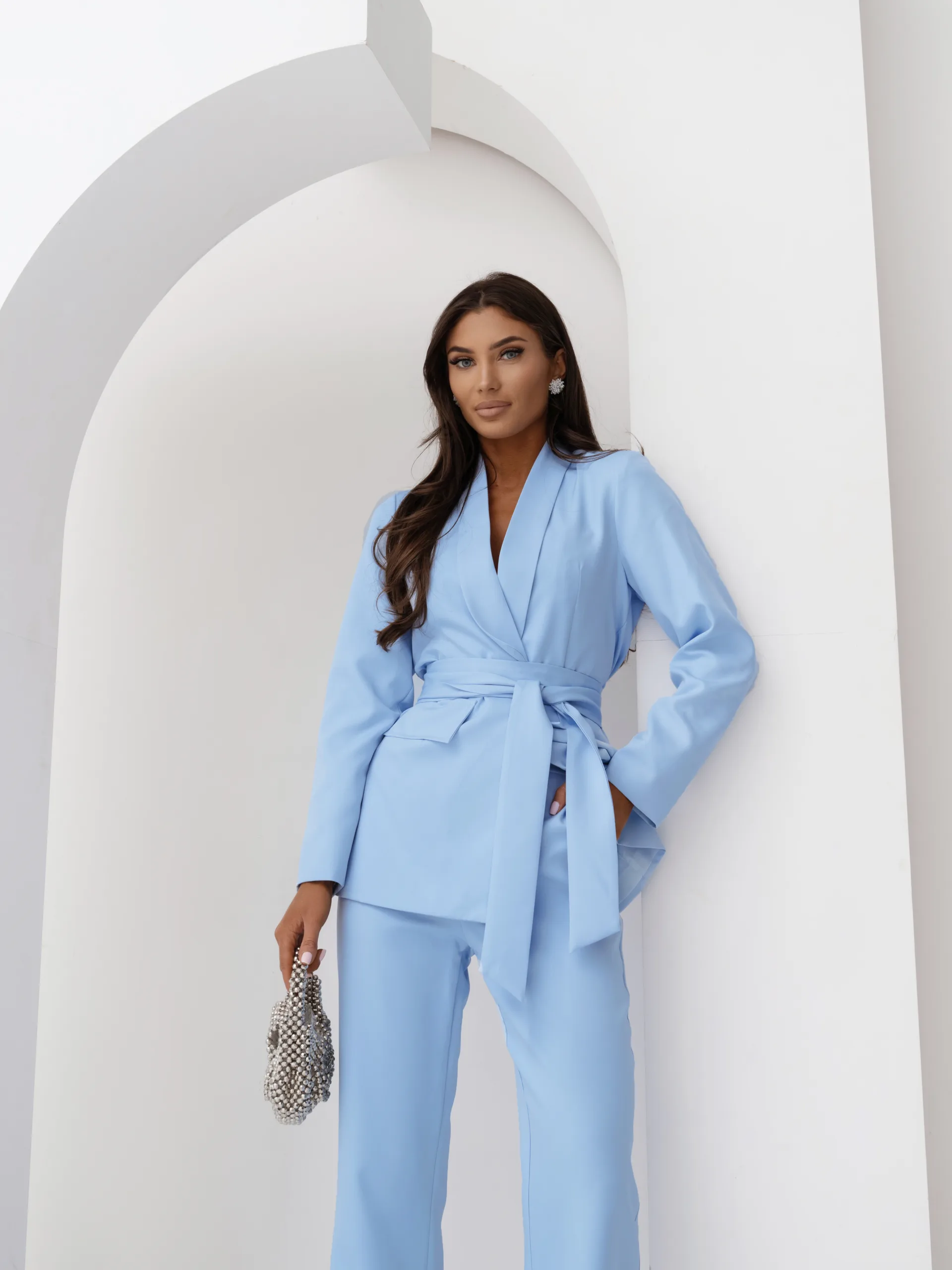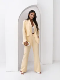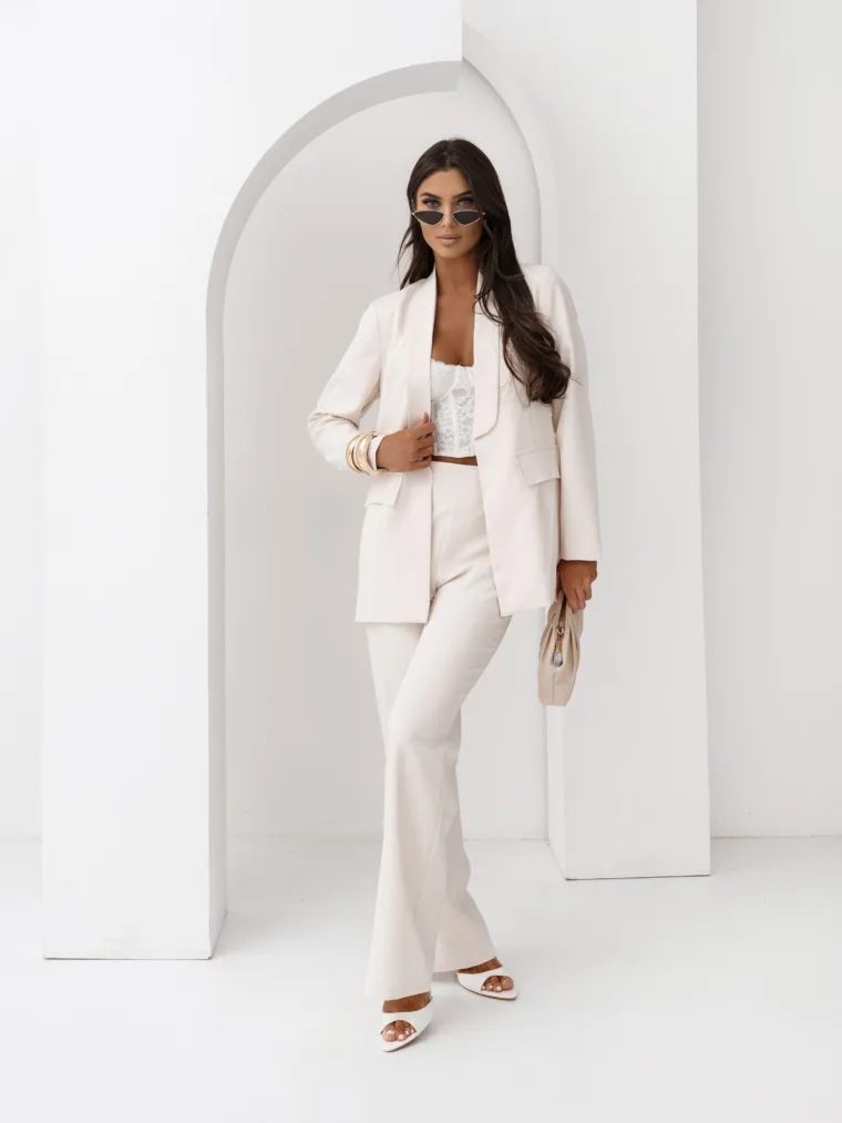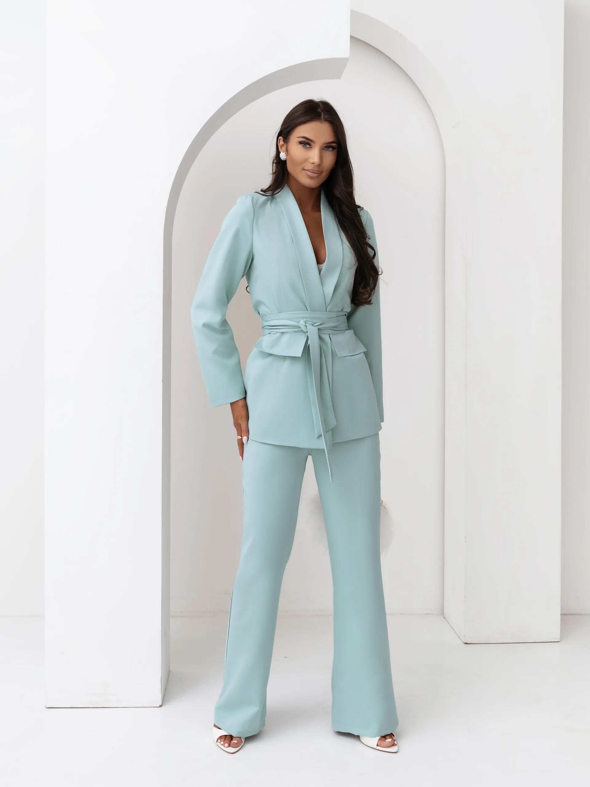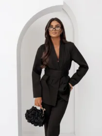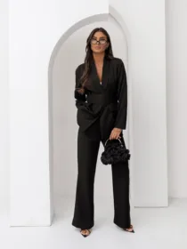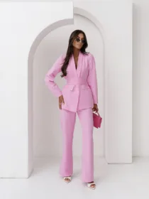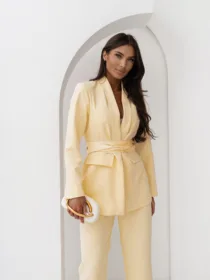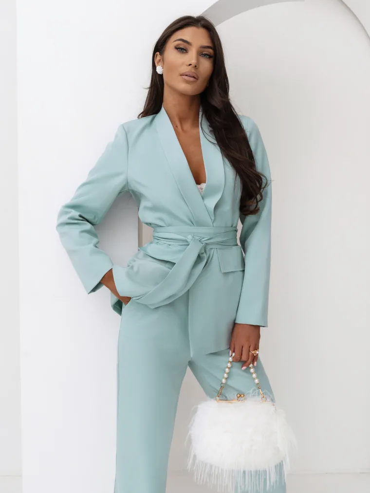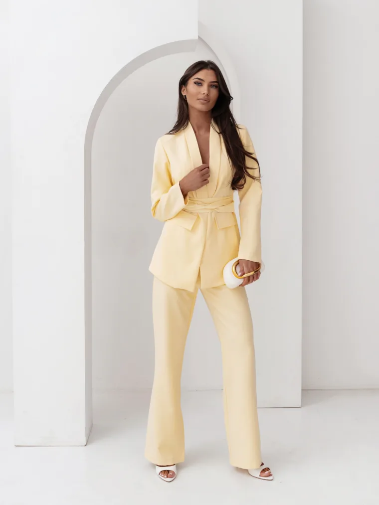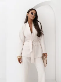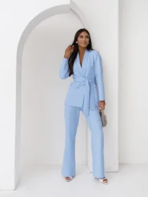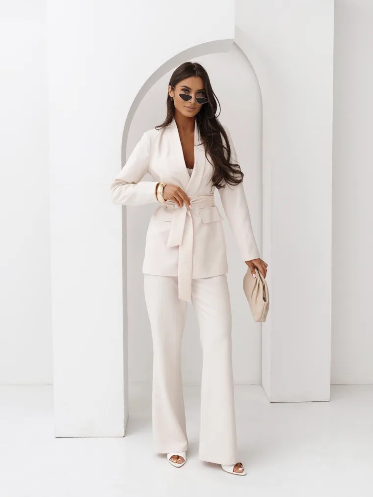 Elegancki komplet damski z wiązanym paskiem i szerokimi spodniami. Nowoczesny garnitur damski do butików – idealny na sezon komunijny, weselny i biznesowy. Kobiecy, dopracowany krój, który pięknie podkreśla talię i wydłuża sylwetkę.