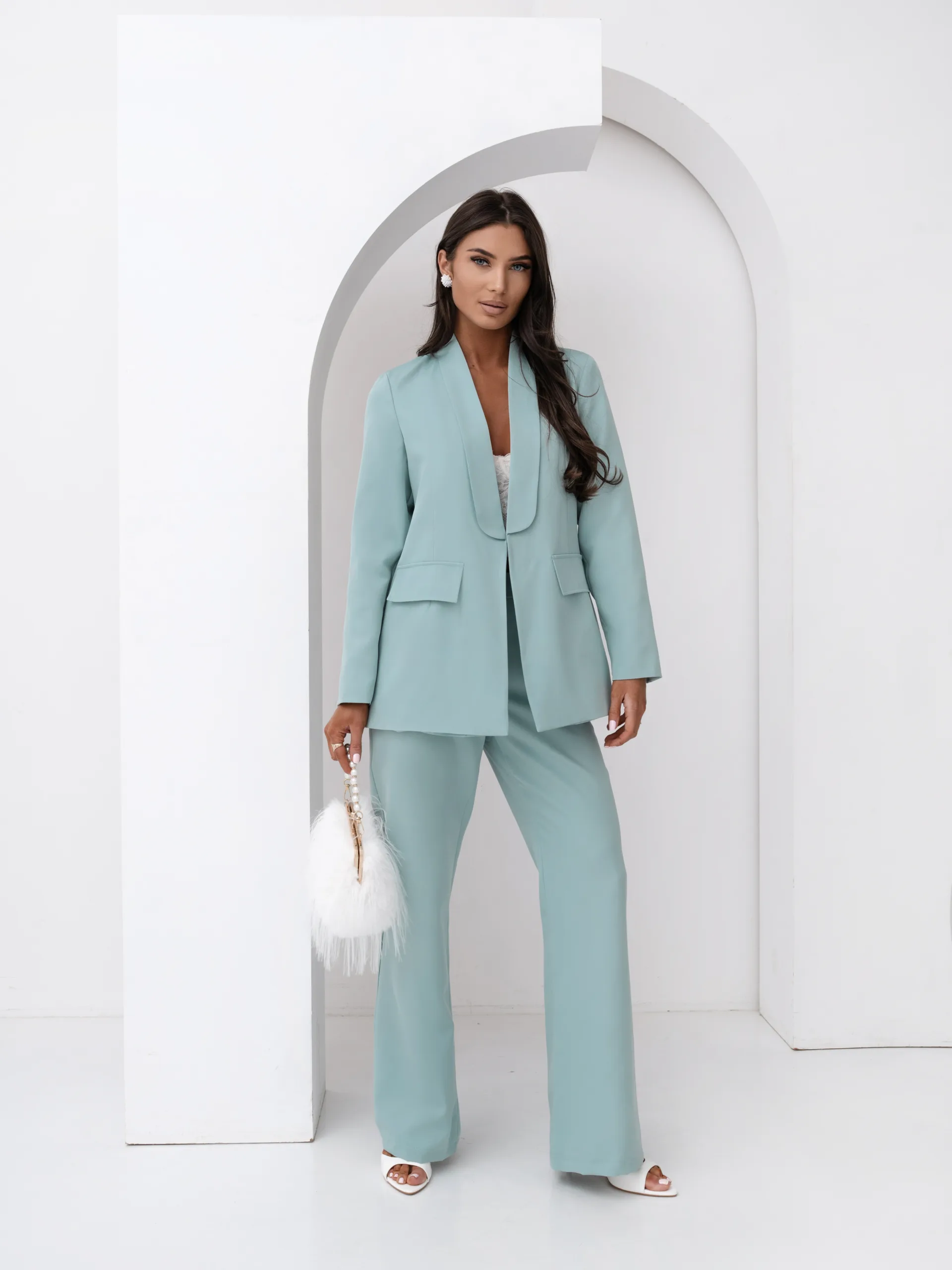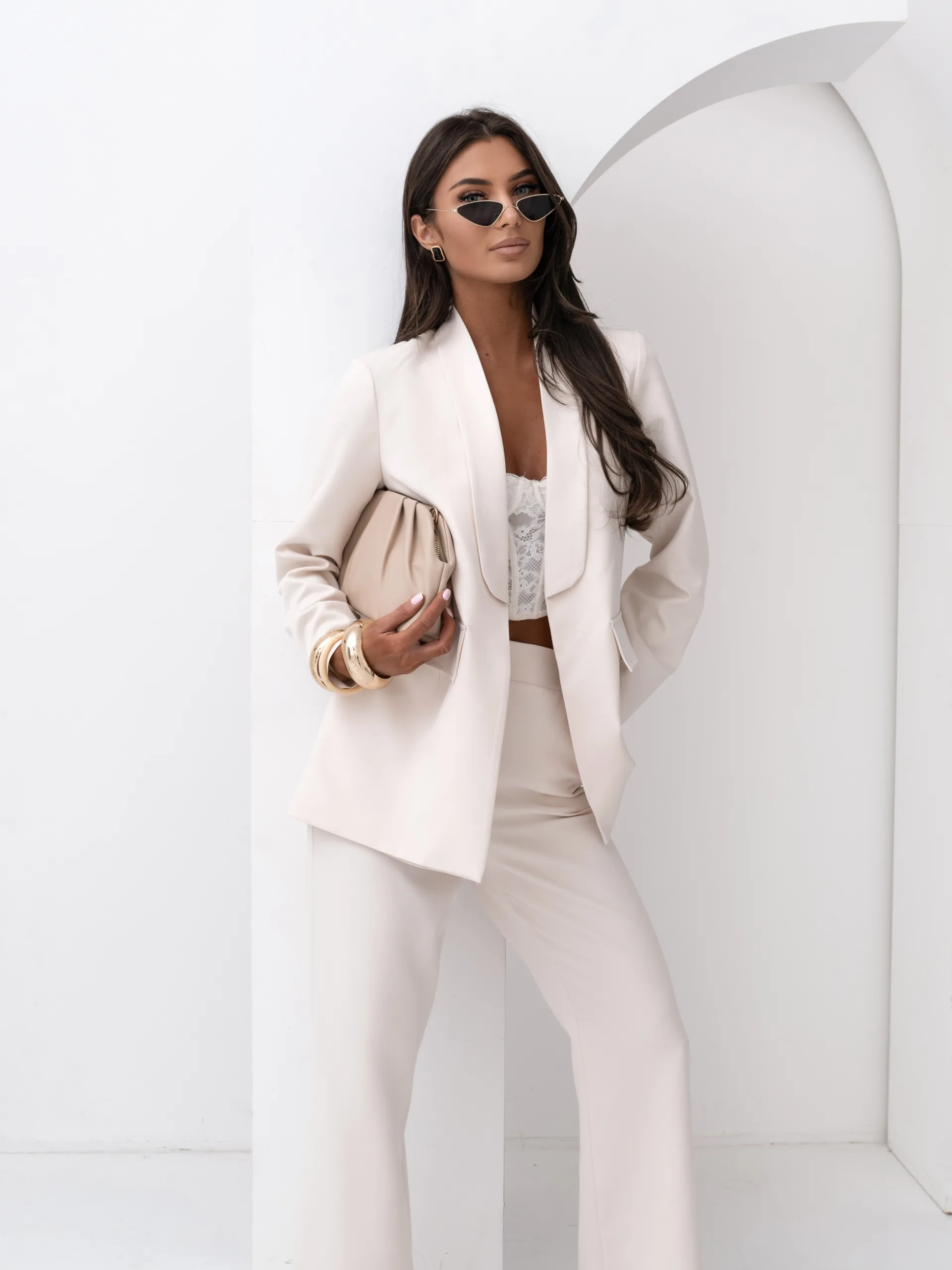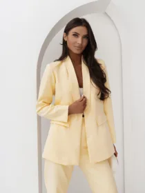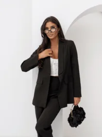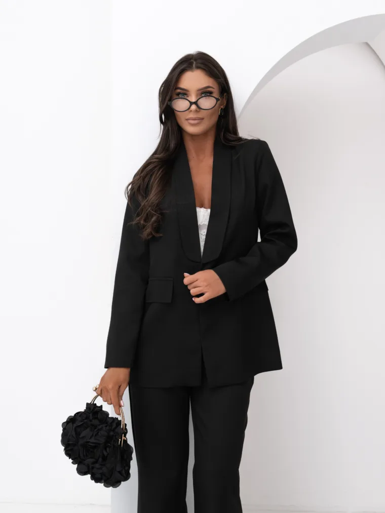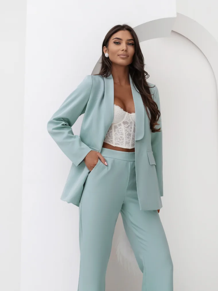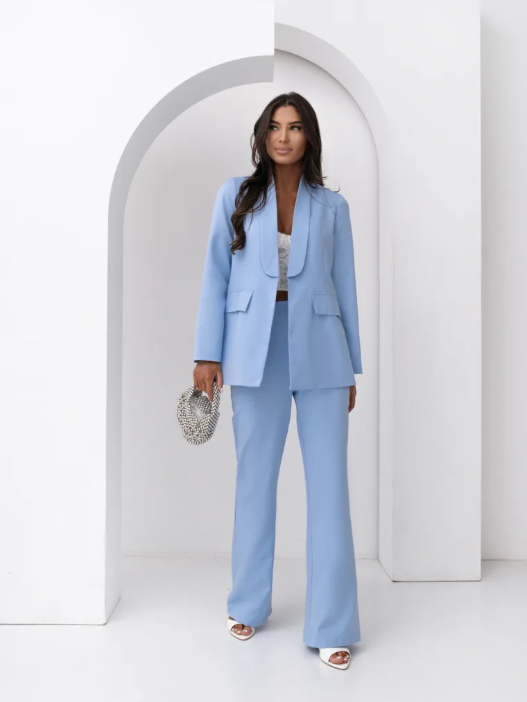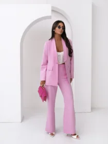 Elegancki komplet damski z wiązanym paskiem i szerokimi spodniami. Nowoczesny garnitur damski do butików – idealny na sezon komunijny, weselny i biznesowy. Kobiecy, dopracowany krój, który pięknie podkreśla talię i wydłuża sylwetkę.