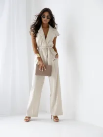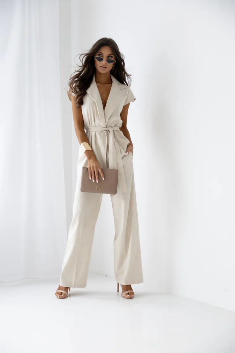 Komplet lniano wiskozowy Earthly Charm z hurtowni e-moon.pl, to połączenie naturalnej elegancji i komfortu. Lekki, przewiewny materiał z lnu i wiskozy zapewnia wygodę noszenia, a subtelny design emanuje naturalnym urokiem. Szerokie spodnie, wygodny krój, pasek w talii w zestawie. Zamów bezpośrednio od producenta odzieży e-MOON.pl