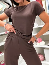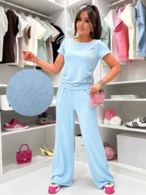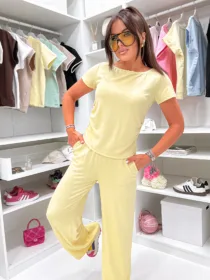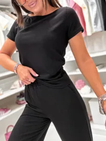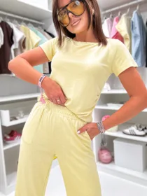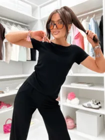Odkryj Komplet Susan  od e-moon.pl – polskiego producenta, który rozumie potrzeby nowoczesnych kobiet! Materiał wykonania MASEŁKO W PRĄŻEK .Ten stylowy,  zestaw basic składa się z dopasowanego t-shirtu z okrągłym dekoltem i krótkim rękawkiem oraz spodni z luźną, rozszerzaną nogawką. To idealna baza do codziennych stylizacji, łącząca modny look z pełną swobodą. Najlepsza oferta na rynku w niskiej cenie hurtowej dla Twojego butiku!