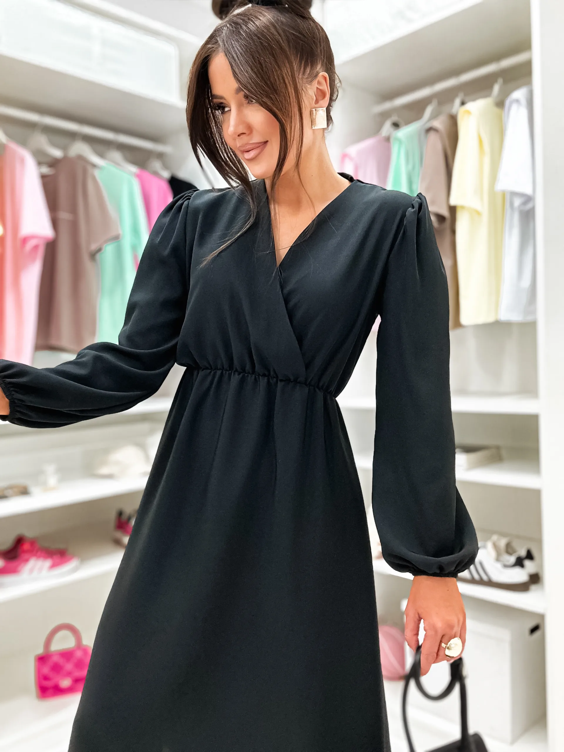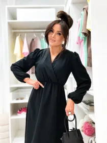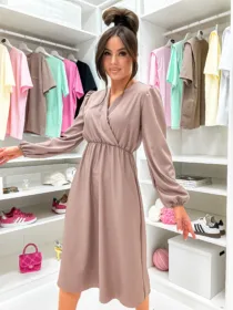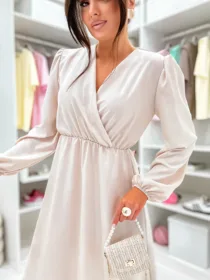 Kobieca sukienka z kopertowym dekoltem i odcinaną talią, która pięknie modeluje sylwetkę. Zwiewny dół i długie rękawy czynią ją idealnym wyborem na komunię, chrzciny, wesele oraz wiosenne uroczystości. Klasyczny fason o wysokim potencjale sprzedażowym.