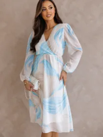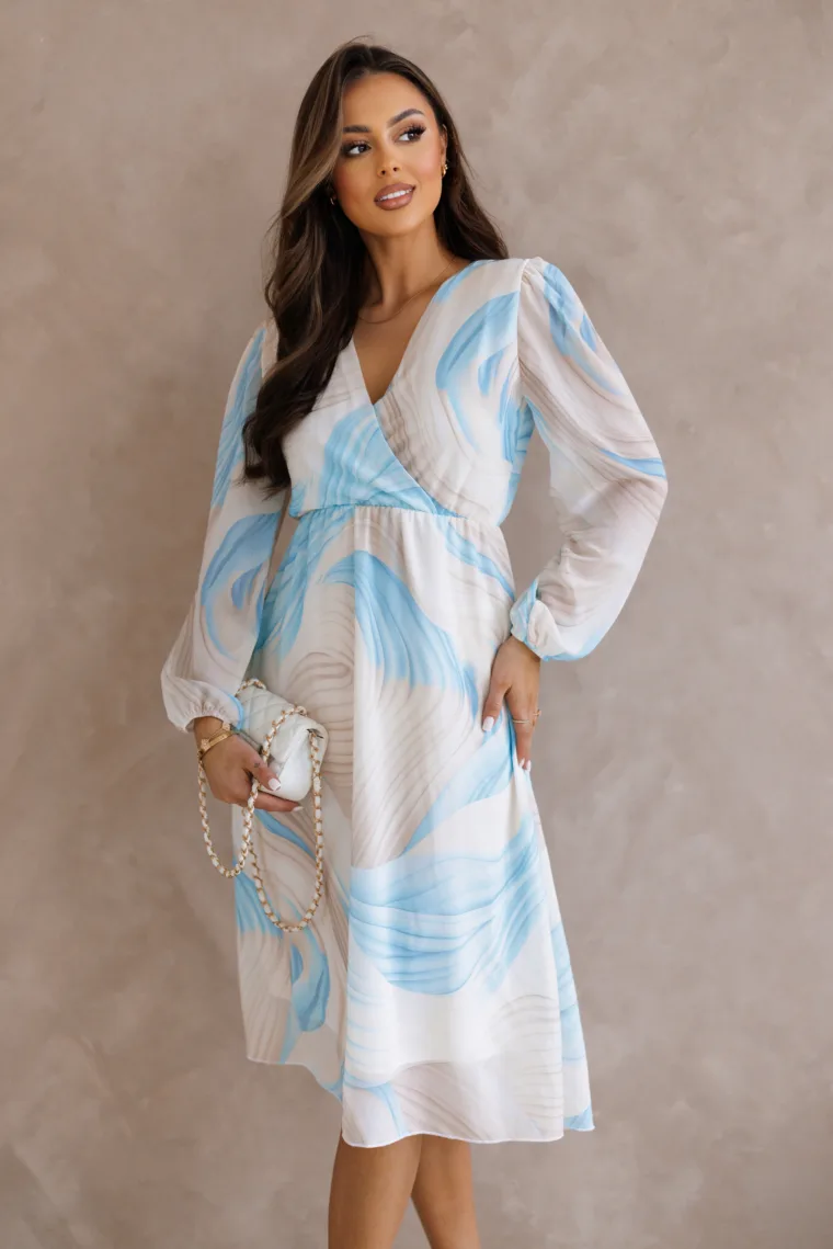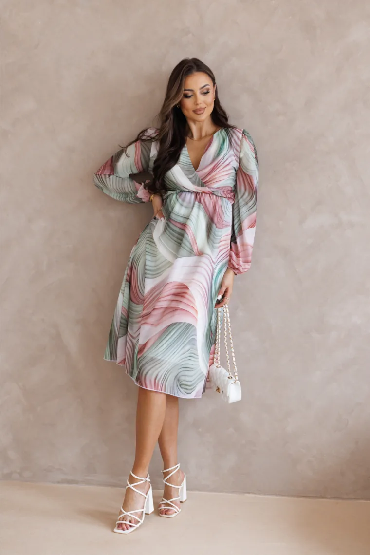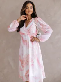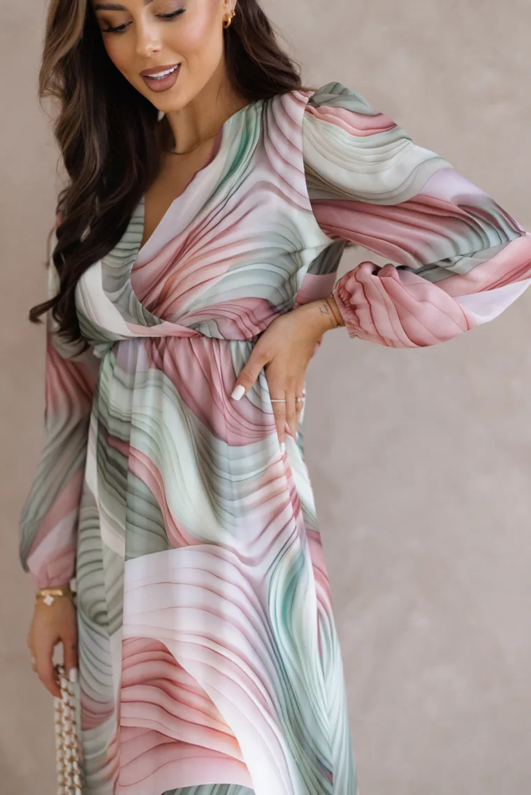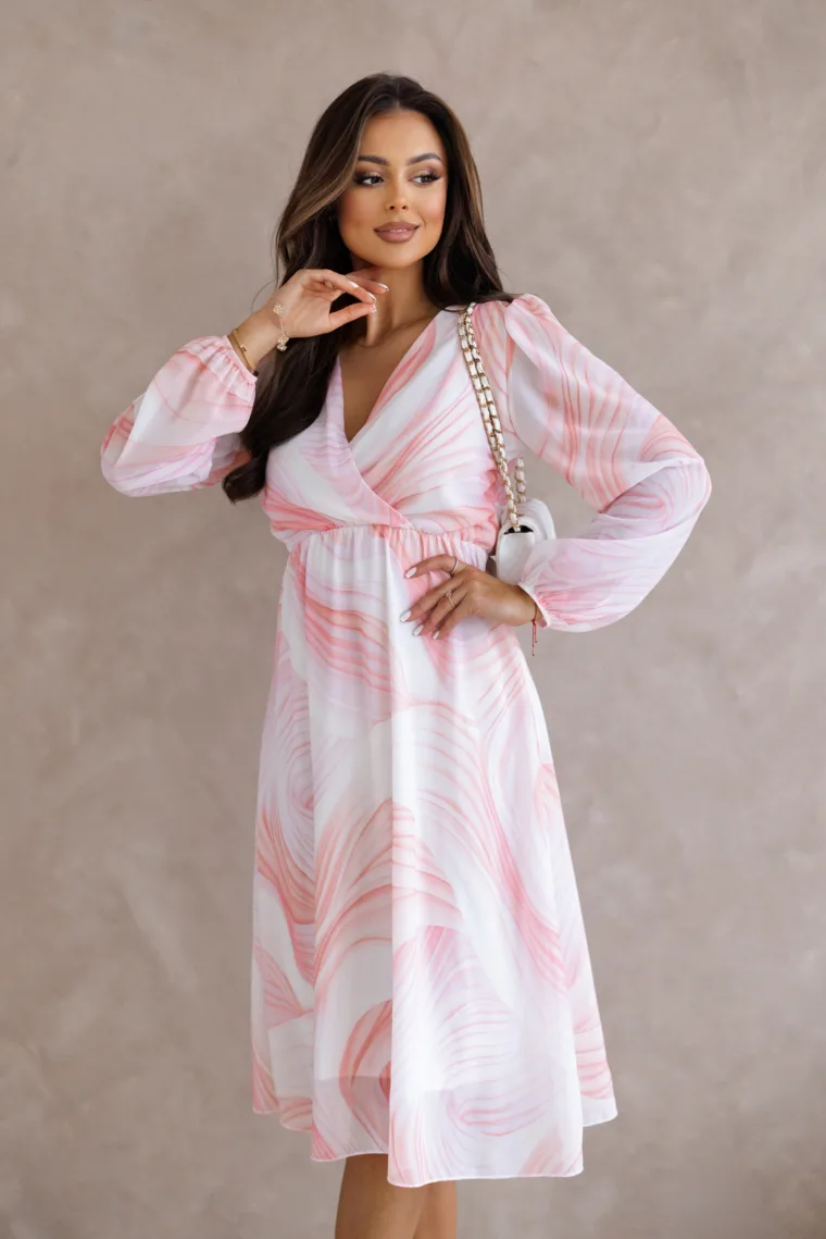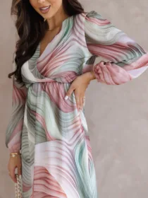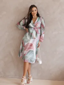 Kobieca sukienka midi z kopertowym dekoltem i odcinaną talią, która pięknie modeluje sylwetkę. Zwiewny dół oraz subtelny, falujący print nadają lekkości i eleganckiego charakteru. Idealna propozycja do butików – na uroczystości, przyjęcia i elegancki casual.