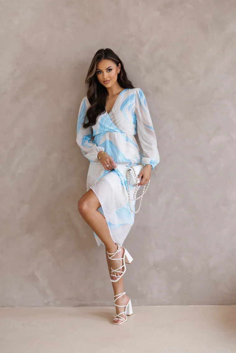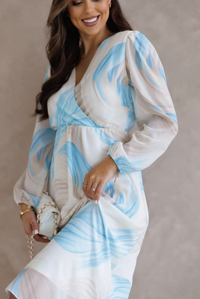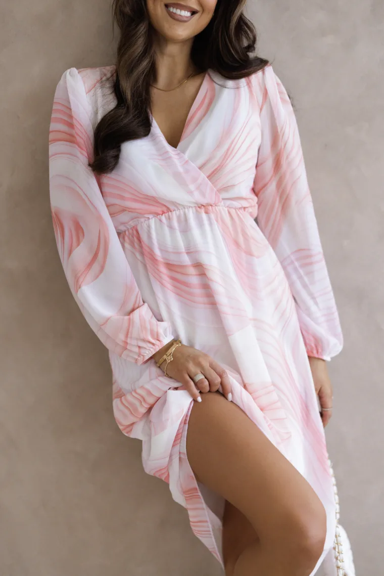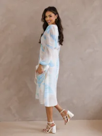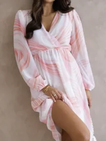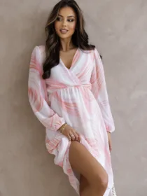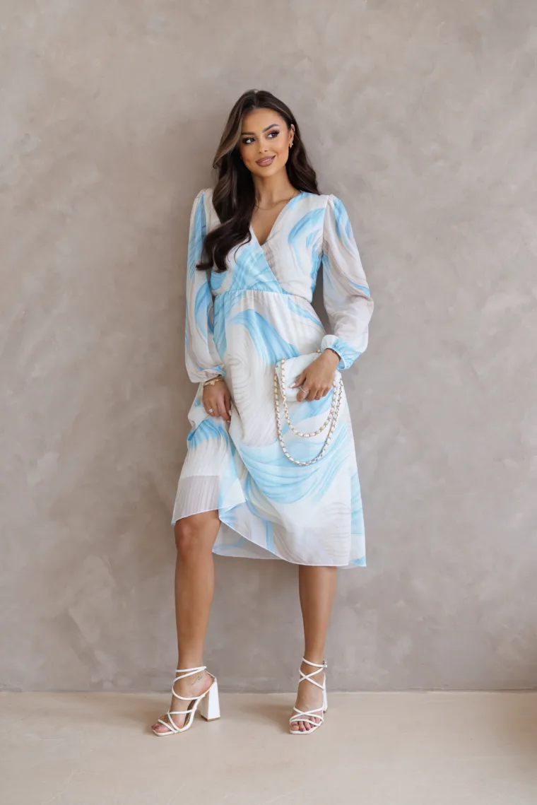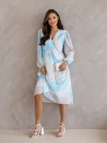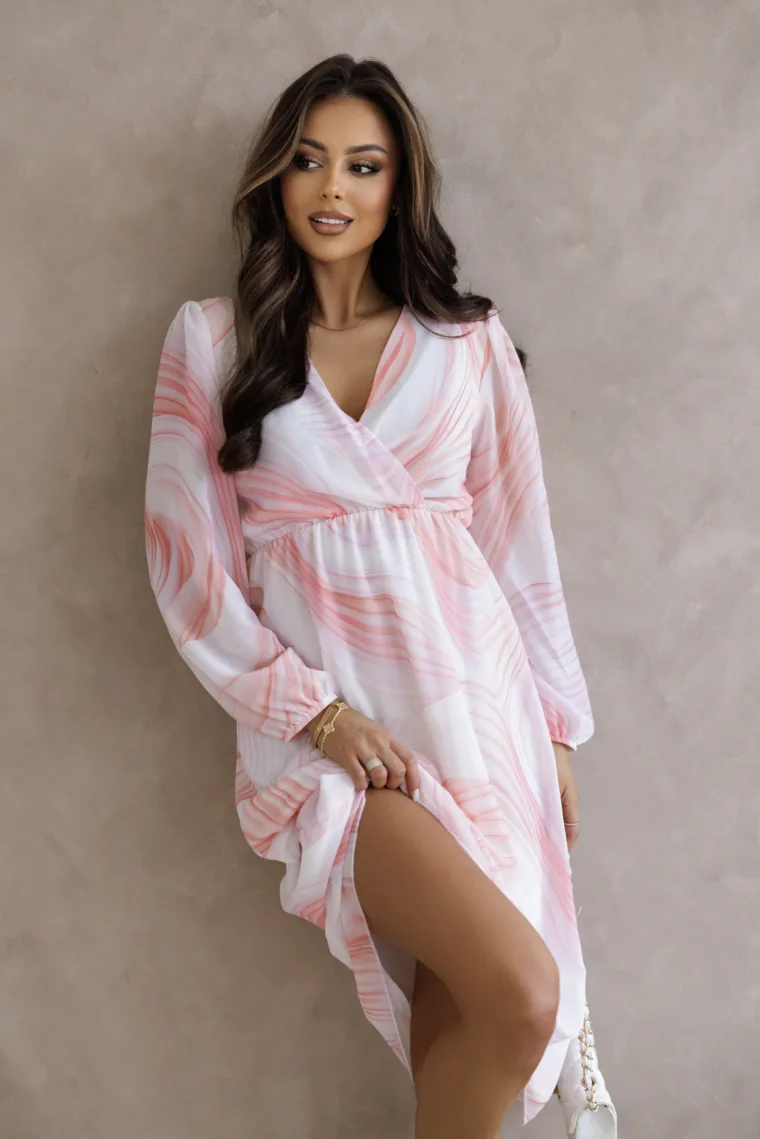 Kobieca sukienka midi z kopertowym dekoltem i odcinaną talią, która pięknie modeluje sylwetkę. Zwiewny dół oraz subtelny, falujący print nadają lekkości i eleganckiego charakteru. Idealna propozycja do butików – na uroczystości, przyjęcia i elegancki casual.