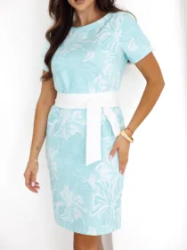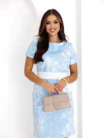 Elegancka sukienka damska z paskiem w talii i delikatnym kwiatowym wzorem. Klasyczny fason pięknie podkreśla sylwetkę i sprawdzi się idealnie na komunie, chrzciny, wesela oraz inne uroczystości rodzinne. Model z krótkim rękawem o długości do kolan zapewnia komfort noszenia i elegancki wygląd.