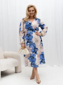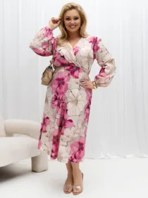 Kobieca sukienka plus size w wyrazisty kwiatowy print z kopertowym dekoltem i odcinaną talią. Model idealny do oferty butików w kategorii sukienki 2XL 3XL 4XL hurt, sukienki na komunię plus size oraz wiosenna odzież damska hurt.