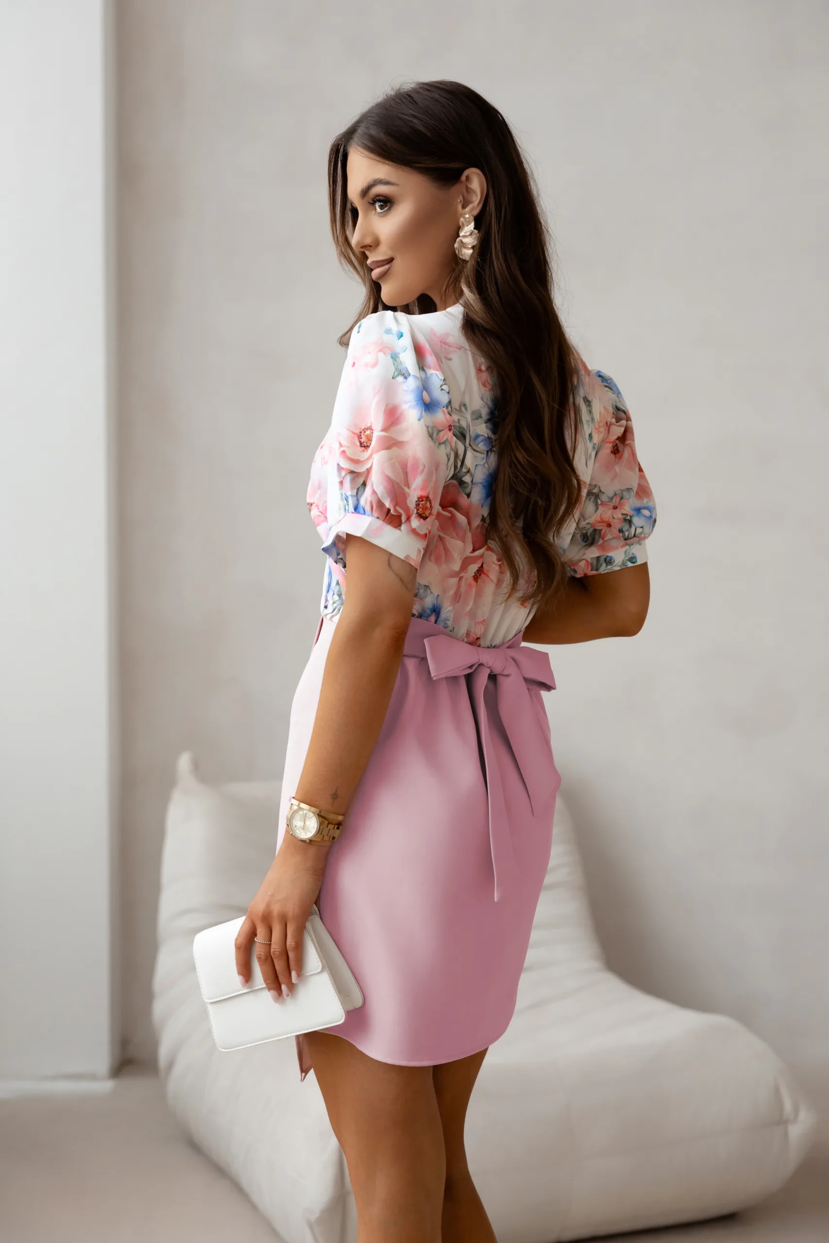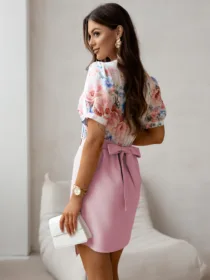 Sukienka BLOOM to idealna propozycja dla kobiet ceniących styl i wygodę. Wykonana z lekkiego, przyjemnego w dotyku materiału, świetnie sprawdzi się na wiosnę i lato. Kopertowy krój z dekoltem w kształcie litery V pięknie podkreśla sylwetkę, a przyszyty pasek wiązany w talii modeluje figurę i dodaje kobiecego uroku. Bufiaste rękawy oraz romantyczny kwiatowy wzór w odcieniach różu nadają sukience lekkości i świeżości. Długość przed kolano sprawia, że stylizacja wygląda nowocześnie i z klasą. Sukienka idealnie sprawdzi się na różne okazje – od wesel i komunii, po randki i spotkania ze znajomymi. Model BLOOM to must-have w każdej garderobie – łączy wygodę z eleganckim wyglądem i daje wiele możliwości stylizacji. Wystarczy dodać szpilki lub sandały, by stworzyć kompletny look na każdą okazję.